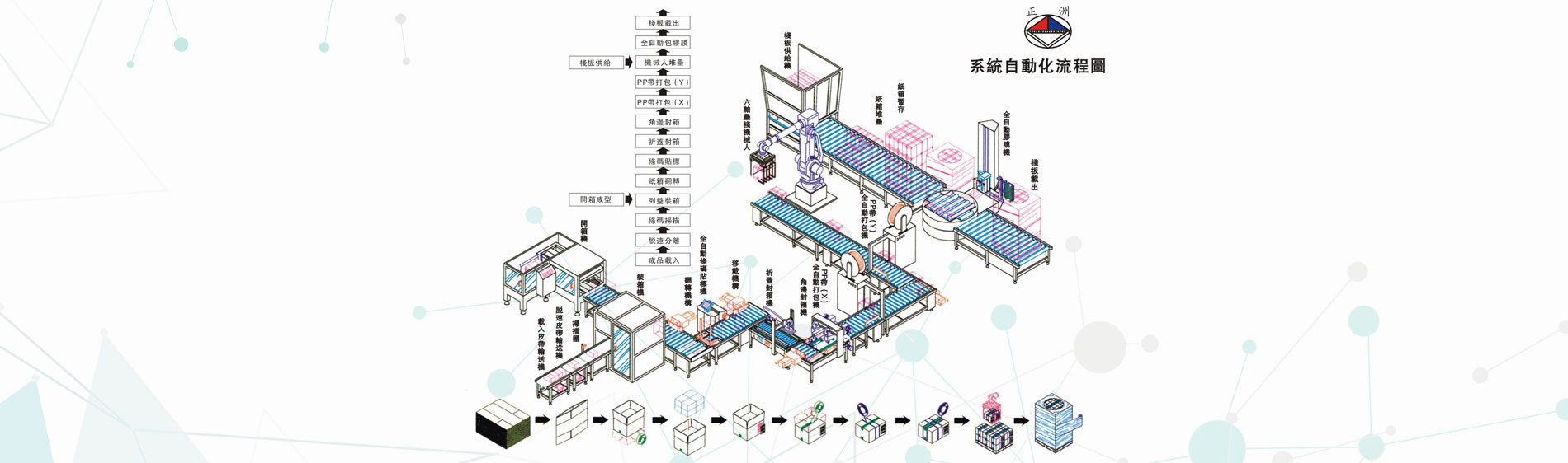 昆山正洲機(jī)電設(shè)備有限公司14年以來,堅(jiān)持設(shè)計(jì)、制造、銷售、售后服務(wù)一條龍服務(wù)。生產(chǎn)經(jīng)營(yíng)范圍迅速擴(kuò)大,形成以下產(chǎn)品系列: 自動(dòng)封箱系列;自動(dòng)打帶系列;自動(dòng)封口熱收縮系列;棧板自動(dòng)包裝系列;抽真空包裝系列;省力真空搬運(yùn)系列;流水線輸送系列;自動(dòng)貼標(biāo)/套標(biāo)系列;熱熔膠自動(dòng)噴膠/貼合系統(tǒng);進(jìn)口手動(dòng)打包工具系列;平面式裹包系列;自動(dòng)倉(cāng)儲(chǔ)系列;塑膠蓋自動(dòng)封蓋系列等各種產(chǎn)品的無人化包裝系統(tǒng)的設(shè)計(jì)與制造。 公元1981年春,在莊志斌先生的帶領(lǐng)下,于桃園成立了一家專業(yè)生產(chǎn)自動(dòng)化設(shè)備的工廠。主要生產(chǎn)后段包裝機(jī)械及PP打包帶,經(jīng)過20多年的苦心經(jīng)營(yíng)已頗具規(guī)模,客戶達(dá)到3000多家。于2001年在廣東成立(東莞)工廠;2002年在江蘇成立昆山正洲機(jī)電設(shè)備有限公司(總部)。